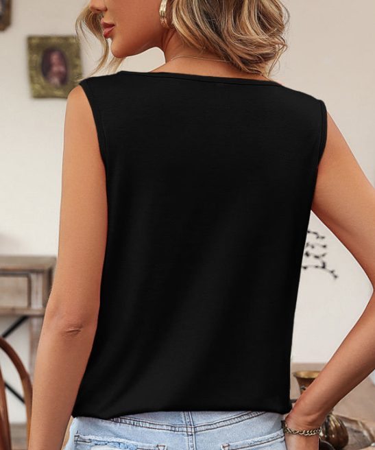 Black Square Neck Solid Color Sleeveless Casual Tops